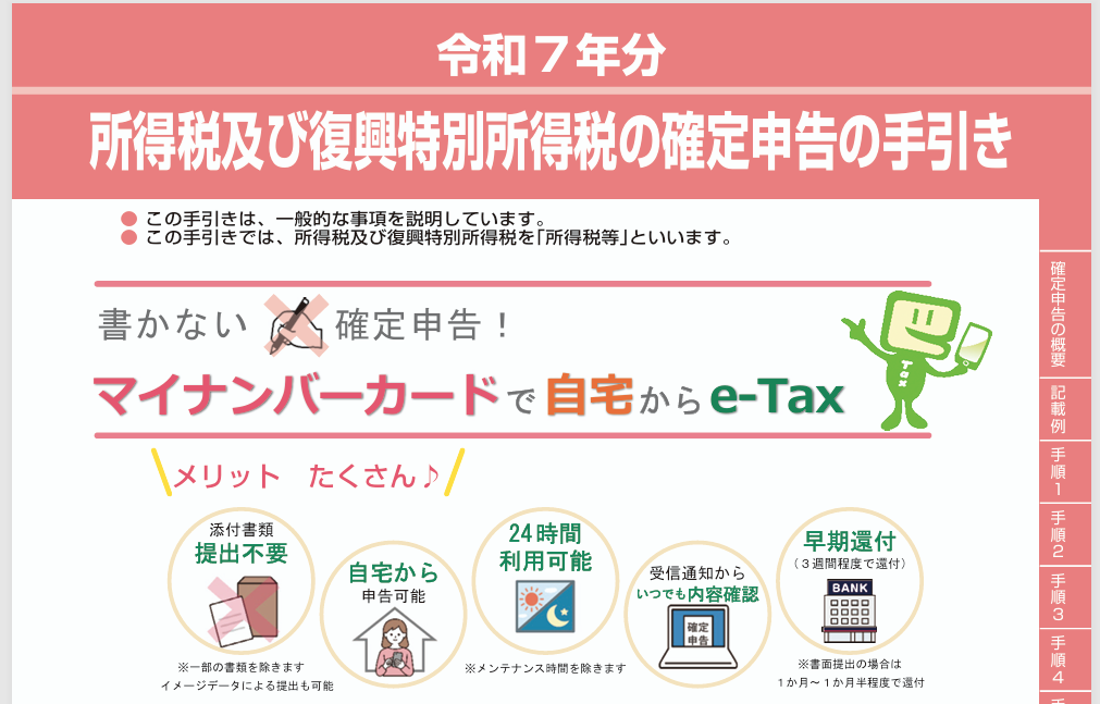〇令和7年分所得税確定申告の手引き https://www.nta.go.jp/taxes/shiraberu/shinkoku/tebiki/2025/pdf/001.pdf